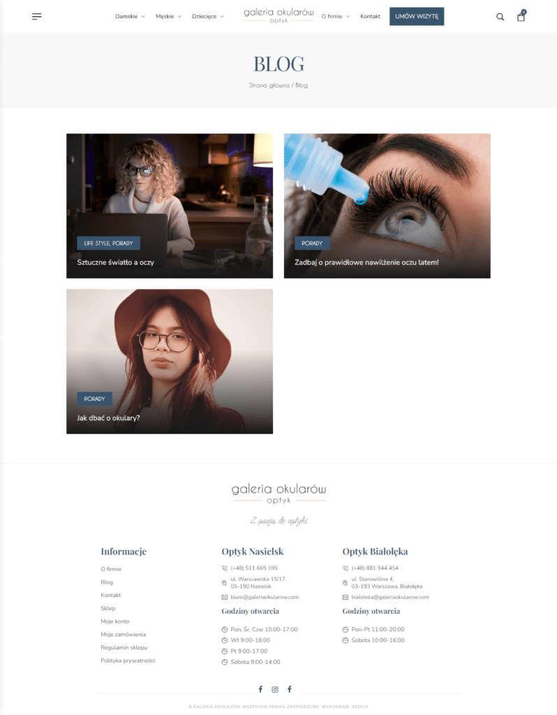A special form for making an appointment with an ophthalmologist or optometrist has been created. The form is intuitive and easy to use, and provides quick appointments, allowing patients to choose a convenient date. In addition, the form allows patients to provide detailed information about their needs, allowing specialists to better prepare for the appointment. The website will also be optimized for SEO, increasing its visibility in search engines, attracting more potential customers. Thanks to WooCommerce, the eyeglass gallery’s online store will be a modern, easy-to-use sales tool that will satisfy even the most demanding customers.